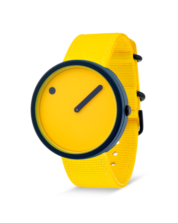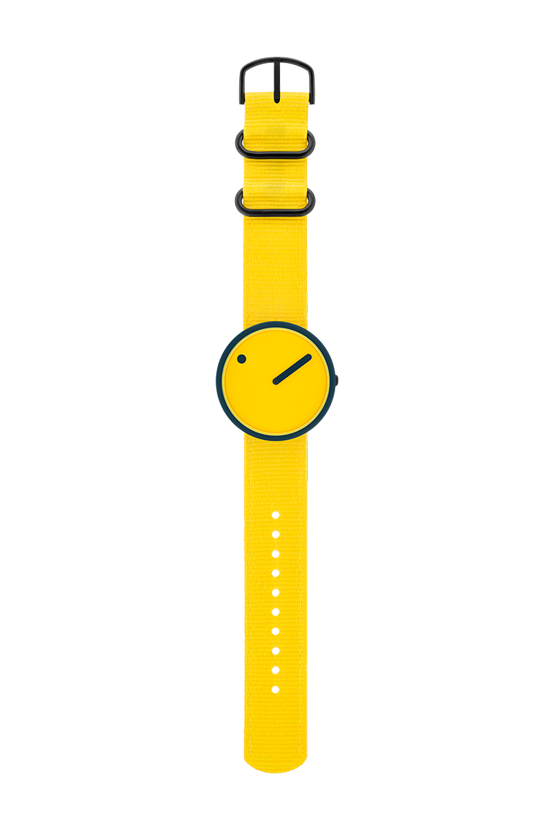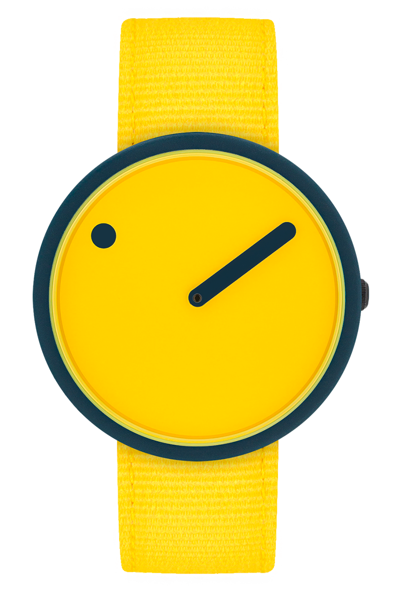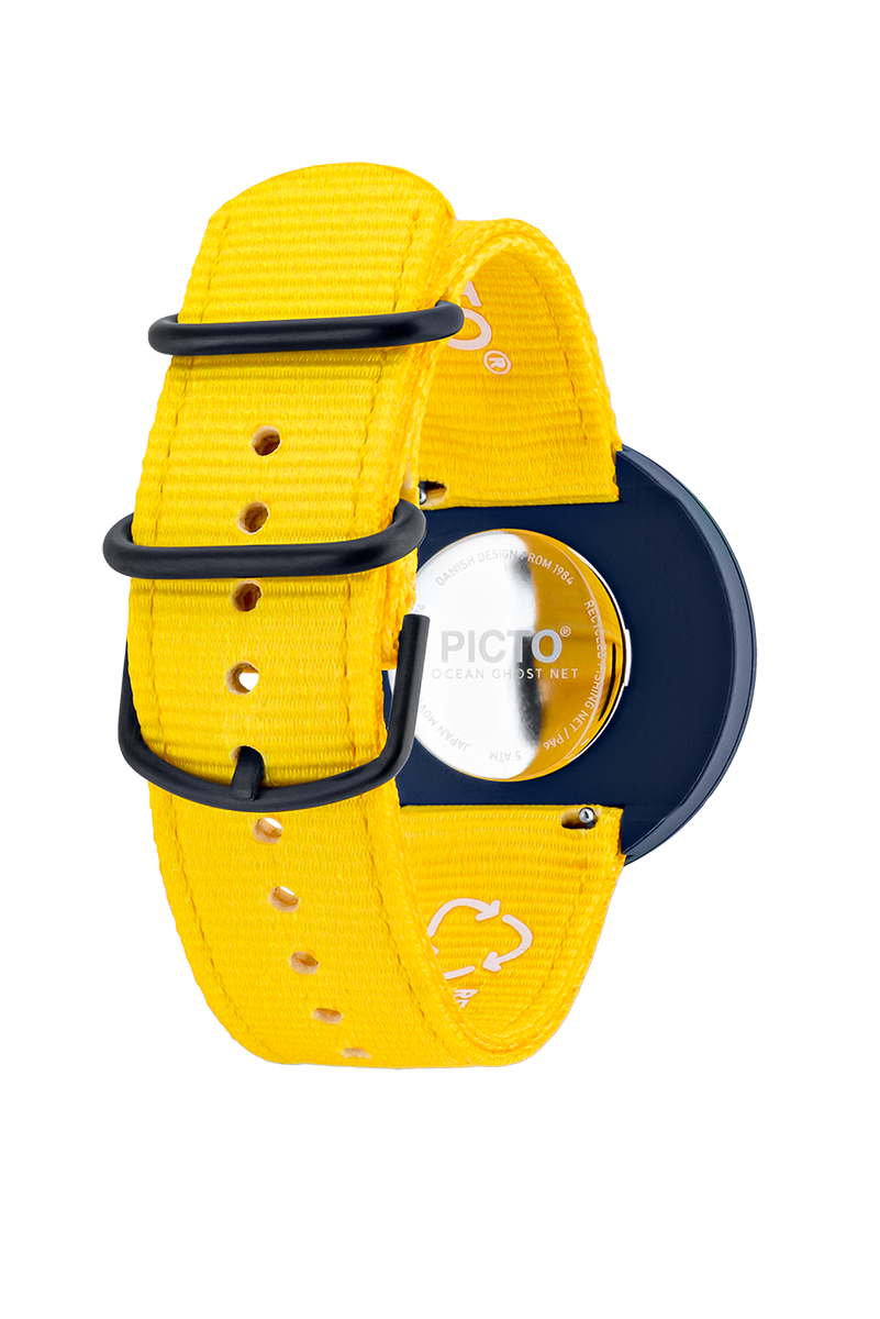 PICTO Ocean Ghost Net 40 mm polshorloge met draaibare wijzerplaat en Electric Yellow gerecyclede bandGerecyclede visnetten PA6, gehard mineraalglas, 5 ATM.